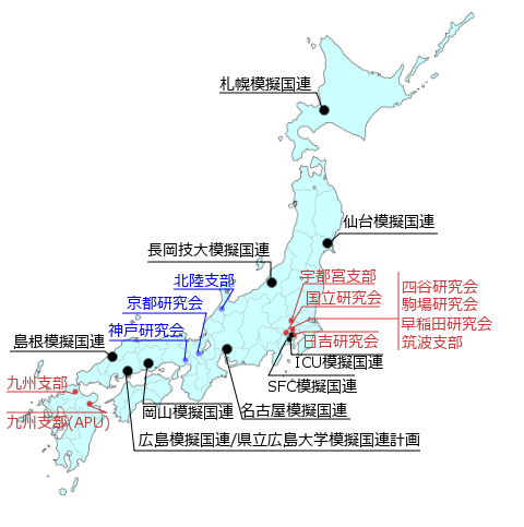 これに加え、日本模擬国連に所属しない模擬国連団体が、 札幌、仙台、長岡、名古屋、広島、島根、岡山にあります。
